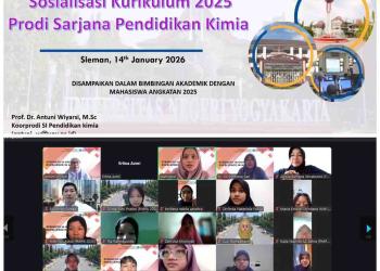 Pada tanggal 14 Januari 2026 Program Studi S1 Pendidikan Kimia FMIPA UNY melaksanakan kegiatan Sosialisasi Kurikulum Angkatan 2025 secara daring melalui Zoom Meeting. Kegiatan ini dihadiri oleh Bapak/Ibu dosen Departemen Pendidikan Kimia serta seluruh mahasiswa angkatan 2025. Kegiatan sosialisasi ini dibuka langsung oleh Koordinator Program Studi Pendidikan Kimia yaitu Prof. Dr. Antuni Wiyarsi, M.Sc. Dalam sambutannya beliau menekankan pentingnya pemahaman kurikulum sebagai pedoman utama dalam perencanaan studi dan pelaksanaan...